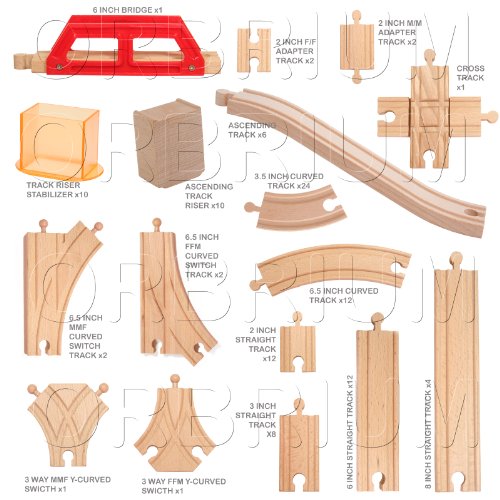 - Improved from the previous popular Orbrium Toys Multi-level Deluxe 100 Piece Wooden Train Track Expansion Pack Set (ASIN: B004H2QO2U)