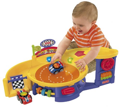 Ready, set, spin. Baby will love the put-and-take fun of placing two cool race cars on the ramp. They roll down and around on the swirling, light-up raceway, then, surprise. The spinning action sends each car out to the exit ramp and under the spinning flag. Or baby can pull the gearshift to start the fun. Zooming speedway sounds, lively music and five flashing lights ramp up the excitement, with a winner every time. Enhances Learning Through Discovery: Strengthens problem-solving skills