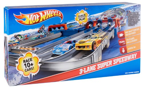Hot Wheels 3-Lane Raceway and 10-Car Bundle: There's a long stretch of highway just waiting to be raced! This huge raceway plugs in for nonstop speed, lane switching action, and crashing cars. Race over 10 cars at once for the ultimate racing fun! Features speed boosters and lane changing capabilities. Includes 3-Lane Raceway track and 10 Hot Wheels cars.