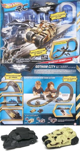 Hot Wheels R/C Batman The Dark Knight Rises Slot Car Set: Inspired by the hit new Batman film, The Dark Knight Rises. Batman is known for his vehicles, and this set delivers two of his more unique models: the Bat and the Tumbler. They have different purposes, but both are built for speed and endurance. Here, the Bat stands in for Batman to battle an ominous Tumbler in great head-to-head racing action that includes an up-the-wall climb. Will good or evil come out ahead?