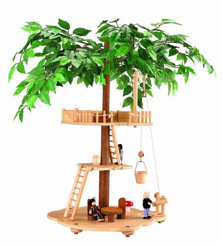 Why live in a regular house, when you can live in one up in the trees! Climb the ladders, pull the pulleys, and relax in the shade under the canopy of leaves from the top of your fun new playhouse. Comes with three figures, pulley system, table and chairs, bucket, barrel, and treasure chest.bucketbarreland treasure chestHeight_ 19.2Width 5.8Length 19Age 4Material Wood